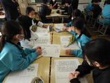 2年生の美術では、天然顔料を使って、小さな屏風に絵を描く授業を行っていました。それぞれ、工夫を凝らして、味わい深い作品を仕上げていました。できた作品は、タブレットで写真を撮って、提出しました。