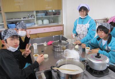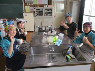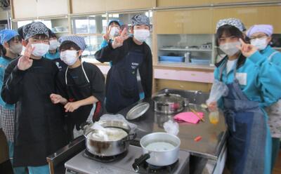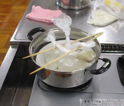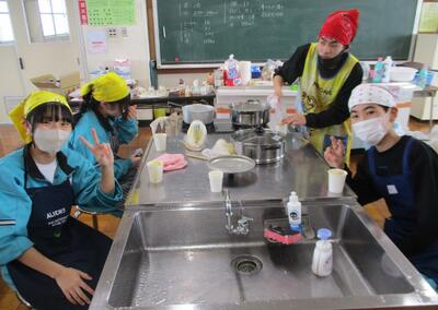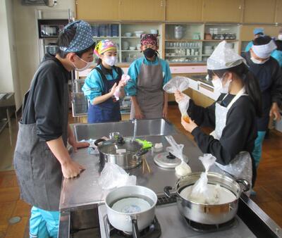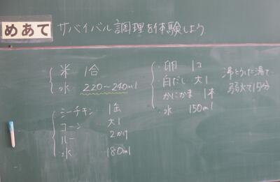 1年生の家庭科の授業でサバイバル調理に挑戦しました。サバイバル調理とは、災害時などで調理器具が十分に無い状態でも、健康を保つために必要な栄養を摂るための調理方法です。今回は、鍋が一つしか無い状態で、ご飯、カレー、茶碗蒸しの3種類の調理にチャレンジしました。