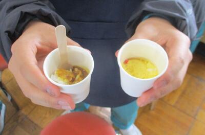 子どもたちは、できあがったカレーライスと茶碗蒸しを「おいしくできた。」と、うれしそうに食べていました。