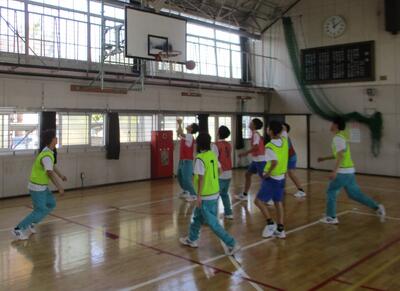 女子は体育館でバレーボールをしました。コートを3つに区切り、4人で試合形式をしました。
